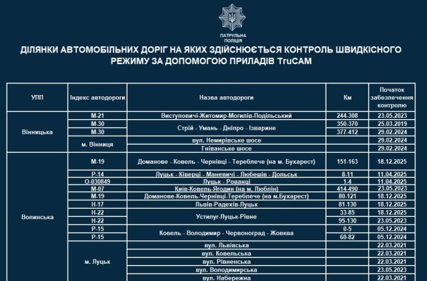Від сьогодні патрульні працюватимуть з приладами TruCAM на 14 нових ділянках доріг та вулиць населених пунктів. Про це повідомляє Патрульна поліція України.